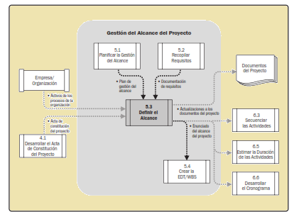 El siguiente proceso 5.3, tiene el objetivo de desarrollar el primer componente de la línea base del alcance; el enunciado del alcance del proyecto; consistiría en la descripción detallada del proyecto, es decir: cómo tiene que ser el proyecto –el trabajo que hay que realizar-, para cumplir con los requisitos del mismo.