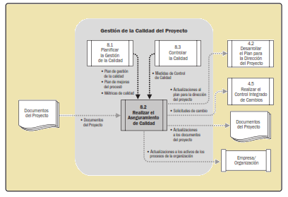 Entrando en detalle, en el proceso 8.1, se obtienen los dos planes subsidiarios del plan director del proyecto que pertenecen a esta área de conocimiento: el plan de gestión de la calidad (incluyendo las métricas de calidad y las listas de chequeo) y el plan de mejora del proceso.
