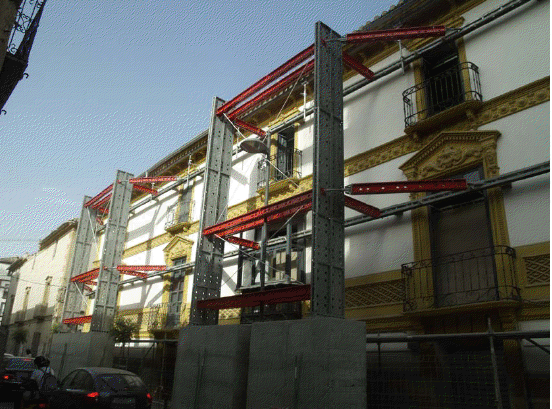 - Instalación de estructura contrapesada utilizando el sistemas de estabilizador exterior, sujetando la fachada horizontalmente con lineas de atado, fijando la fachada horizontalmente con correas y varillas pasamuros, para evitar el efecto de vuelco del muro de fachada a Lope Gisbert.