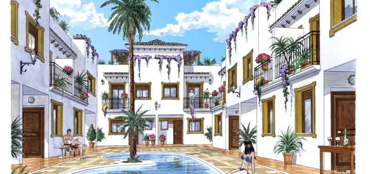 Residencial de viviendas adosadas en manzana cerrada en la costa de Mojacar para habitantes de segunda residencia. Diseño de estilo tradicional y al gusto del promotor de esta zona de Andalucía.