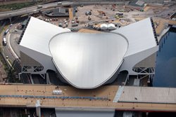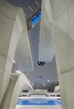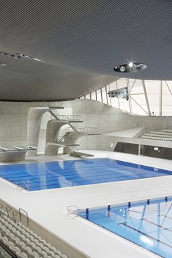 El Centro Acuático de Londres, construido para los Juegos Olímpicos de 2012. El concepto arquitectónico de este espacio está inspirado por las geometrías fluídas del agua en movimiento, creando espacios que reflejen los paisajes de la costa del Parque Olímpico. Una cobertura ondulada se eleva a partir del suelo como una onda, al mismo tiempo que describe el volumen de las piscinas de natación y el buceo.
