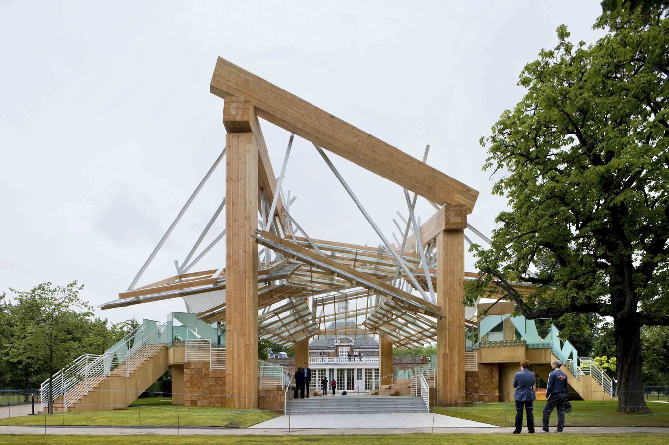 LON02. LONDRES (R.UNIDO), 21/07/08.- El arquitecto estadounidense Frank Gehry, famoso por su diseño del Museo Guggenheim de Bilbao, se estrena en Inglaterra con una estructura adyacente a la Serpentine Gallery londinense que tiene los días contados, ya que se desmantelará en tres meses. En la imagen vista de la estructura que posee la firma geométrica característica de Gehry -Premio Pritzker 1989-, realizada con vigas de madera, cristal y acero para que los visitantes de los jardines reales de Kensington puedan descansar o refugiarse del clima incierto de Londres. EFE/Iwan Baan **SÓLO USO EDITORIAL***