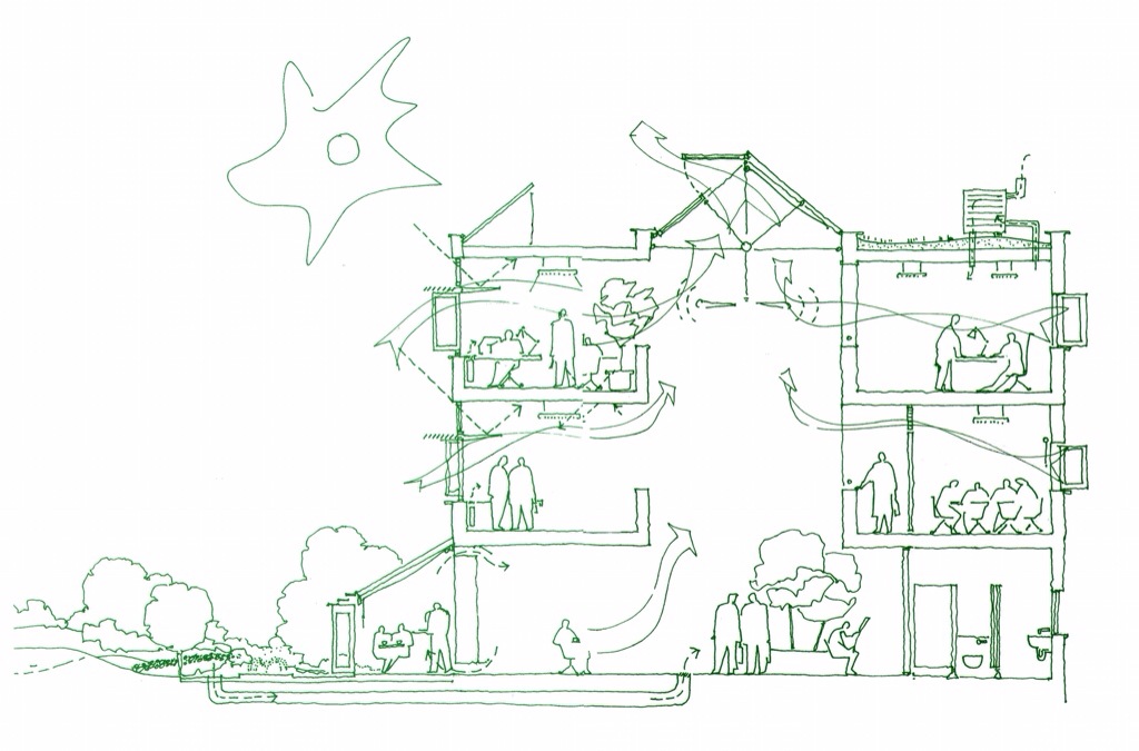 Desde la concepción de la casa, Alternativas Energéticas, se tuvo en cuenta los recursos capaces de cubrir las necesidades energéticas básicas de la vivienda durante su vida útil. No es necesario abrir las ventanas para ventilar las estancias, con el consiguiente ahorro de energía. El aire circula y se renueva en su interior gracias a una unidad de tratamiento que, abastecida por un pozo canadiense(técnica consistente en una serie de tubos enterrados bajo la superficie por donde circula el aire), logra que la casa esté fresca en verano y cálida en invierno con un consumo muy bajo.